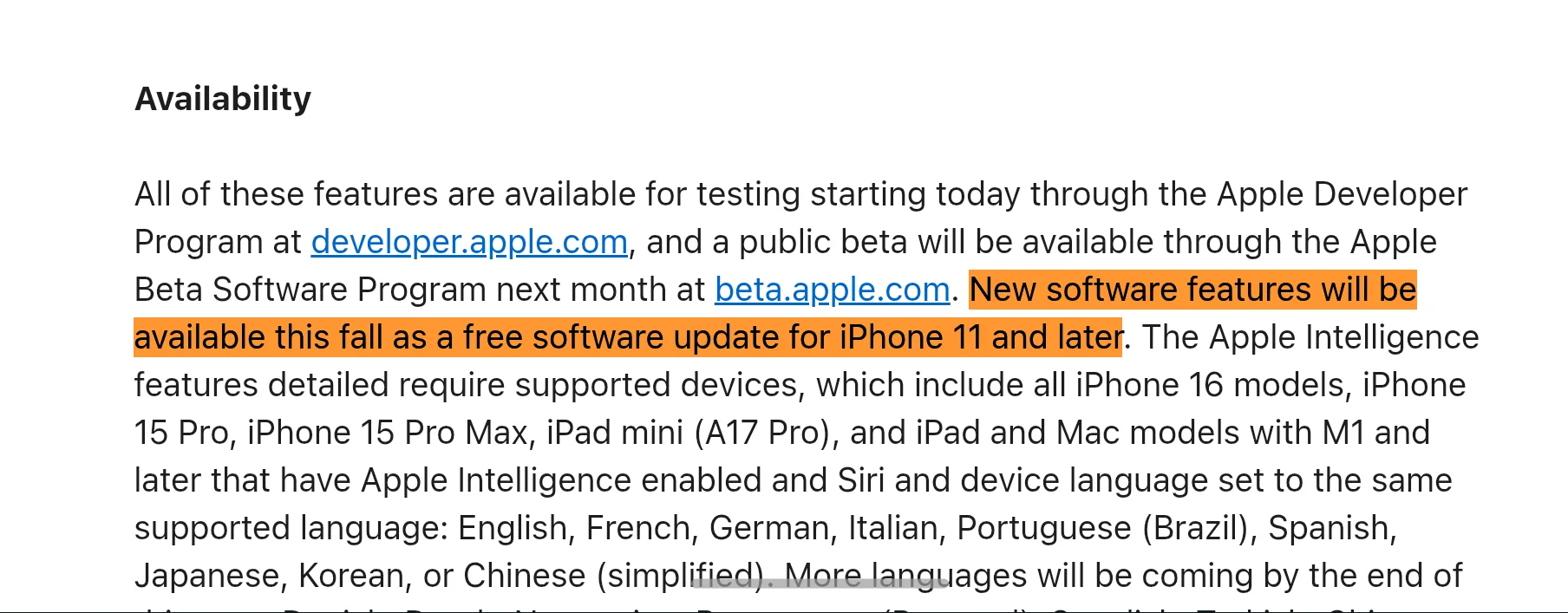애플 공식 페이지에서 “이번 가을 iPhone 11 이상을 대상으로 무료 소프트웨어 업데이트를 통해 새로운 소프트웨어 기능이 제공됩니다“라는 문구로 공식 지원이 iPhone 11 이상부터 시작됨을 강력히 암시하고 있습니다.